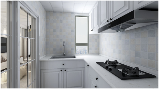 這個廚房屬于L型廚房,首先先說明下L形的廚房布局是什么,這是指所有的工作區(qū)沿兩面挨著的墻布置,水盆放到窗戶一側,操作臺和灶臺放在另一側,形成一個三角的操作空間,符合清洗、加工、烹飪的順序。因為采光問題,整體柜子用的白色為主色調,墻面用了淺色但又顯得豐富顏色的磚,使得整體空間沒有那么單一。