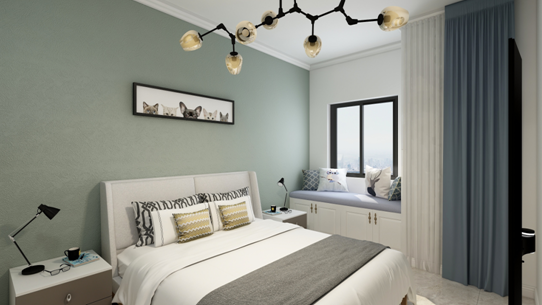 睡床是沿著窗戶擺設,兩邊預留阿足夠的走動空間,床頭背景粉刷灰綠色墻漆,突出床頭背景,與地面地磚顏色相近,看起來甚是和諧。床品采用淺灰色軟包形式,增加臥室的舒適感,配上深灰色的床品床頭兩邊金屬材質的臺燈凸顯了整個空間的大氣感,床旁邊有一個大大衣柜增加了整個屋子的儲物空間,臥室頂面采用石膏線,從視覺不會顯著壓頂.現(xiàn)代住所的開展,小家庭的組成,大家心理上的需求,期望臥室具有私密性、蔽光 性,配套洗浴,靜謐舒服,與住所內(nèi)其他房間分隔開來。我規(guī)劃的臥室除了主臥加了個內(nèi)衛(wèi)外,再者除了擺放雙人床外,留有必定的面積擺放臥室家私,如衣柜,電視柜,床頭柜,還留有必定空間能夠休閑活動