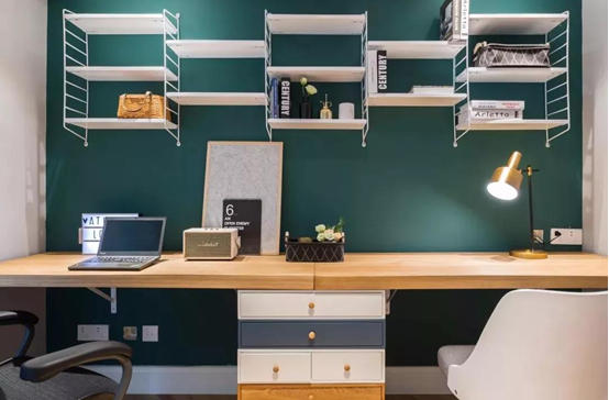 △位于客廳沙發(fā)背后的書房空間,灰色和青色的墻面形成對(duì)比,把鋼琴和書桌區(qū)域分開,墻面的置物架搭配雙人書桌的設(shè)計(jì),滿足了書房的收納需求