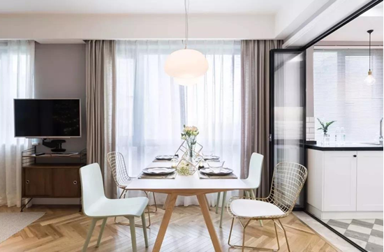 △用折疊式玻璃門將廚房和餐廳隔開,玻璃門既阻擋了油煙的蔓延,又保證了廚房的采光通透性,有利于做飯時(shí)家人之間的溝通。廚房門旁邊的仙人掌在空間上也起到了一定的隔斷作用。廚房內(nèi)部是U字型的櫥柜布局,白色的柜體、黑色的臺(tái)面、小白磚、灰色墻漆的運(yùn)用,讓廚房層次分明,折疊門的使用也讓廚房平時(shí)更顯寬敞。