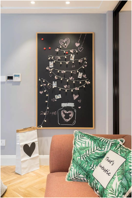 △書房和客廳之間的墻面還掛了一個(gè)小黑板,可以用來記錄屋主一家的點(diǎn)點(diǎn)滴滴,小串燈的“之”字形像是棵圣誕樹,讓這個(gè)地方多出了文藝小清新的感覺。