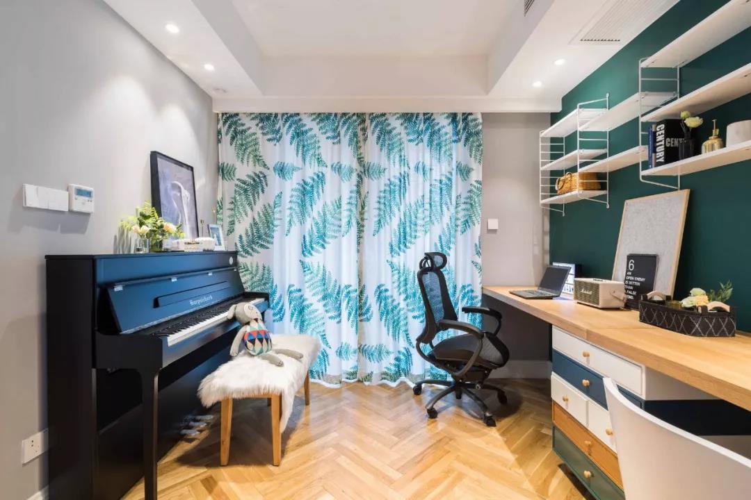 位于客廳沙發(fā)背后的書房空間,灰色和青色的墻面形成對比,把鋼琴和書桌區(qū)域分開,墻面的置物架搭配雙人書桌的設計,滿足了書房的收納需求