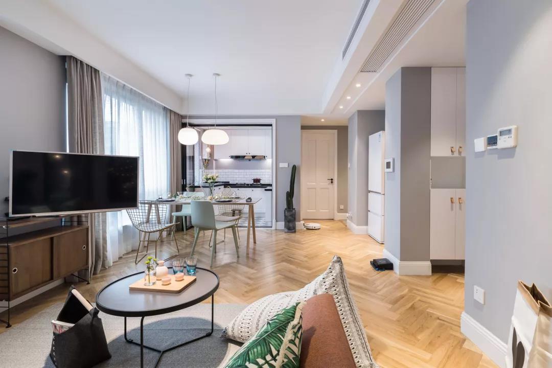 客廳的整個色調分為三個部分,一是墻面的淺灰色,低調中又帶點清新,二是吊燈的暖白色,干凈大氣,三是地板上的木色,三個顏色形成三個大色塊。客餐廳地面都是相同人字拼接的木地板,讓整個空間的整體感和縱深感得以提升。