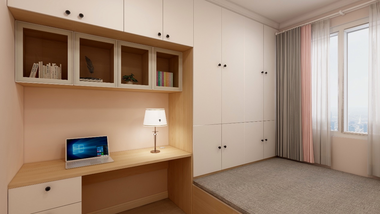 因?yàn)榭紤]到儲(chǔ)物空間及常住人口數(shù)量,考慮次臥室做了個(gè)榻榻米,榻榻米打破了垂直空間收納的慣例,內(nèi)部柜子在水平地面也能發(fā)揮超強(qiáng)的儲(chǔ)物能力,是提升空間利用率的先行者。這樣既增加了整體的儲(chǔ)物空間又兼具寫字臺(tái)及書柜的空間。顏色上考慮用原木色和白色這兩種經(jīng)典顏色做搭配,墻面搭配上孩子喜歡粉色。