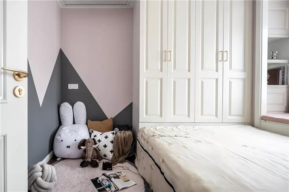 女兒房采用粉丁香色為主調(diào),溫馨而浪漫。墻面做了粉灰兩色的拼色造型,粉色圓形小毯子柔軟而舒適,擺放可愛的玩偶以及有趣的書籍,甜美而不失精致感。