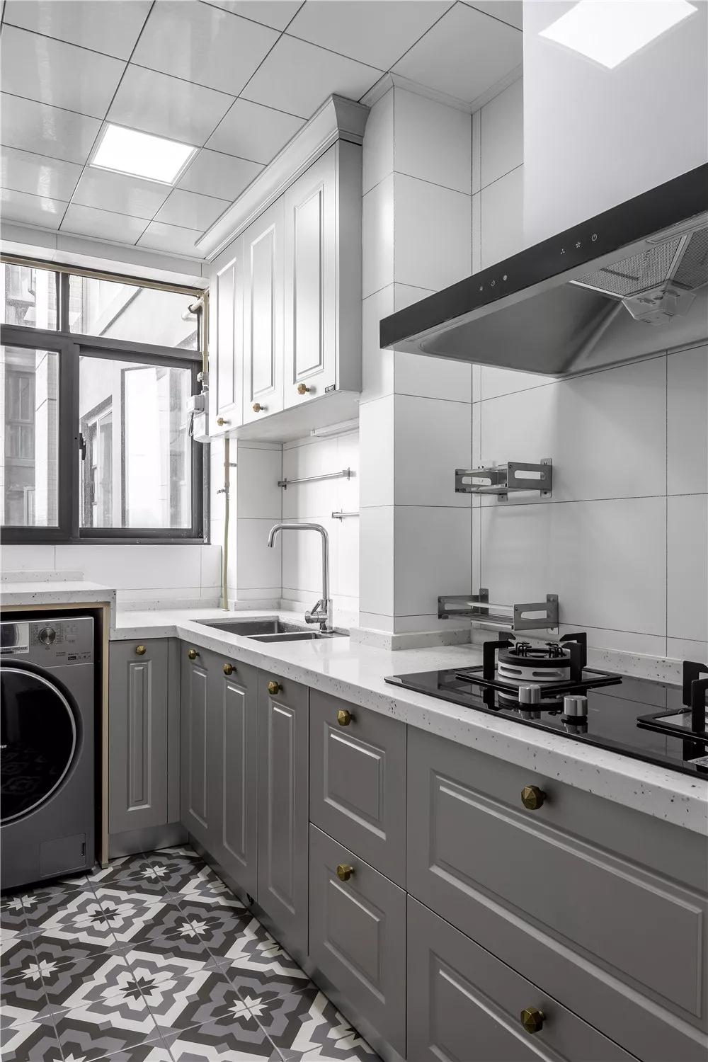 廚房整體以灰白兩色為主調(diào),地磚采用白、棕、灰三種顏色相間的花紋設計,豐富空間層次,精致而有格調(diào)。