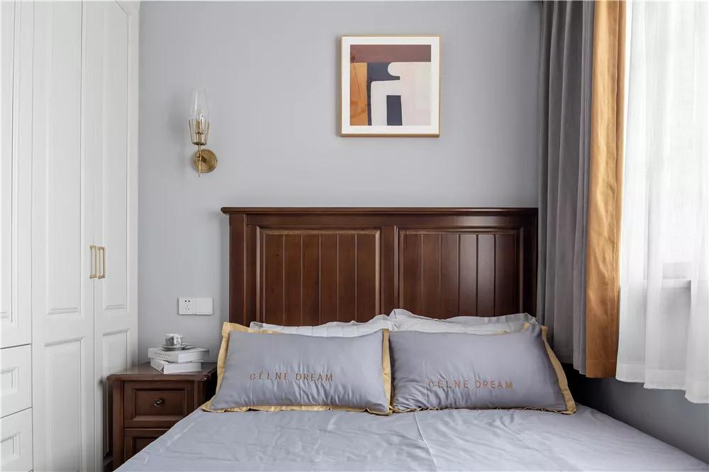 次臥以淺灰色為主調(diào),加以橙色的細節(jié)軟裝,搭配背景墻的金色相框掛畫點睛,簡約內(nèi)斂不顯單調(diào)。