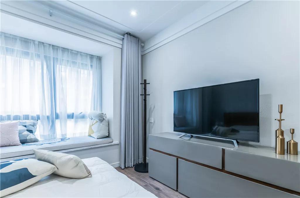 主臥床頭背景墻的淡藍(lán)色飾面板和窗簾,奠定了優(yōu)雅的藍(lán)色主調(diào)。