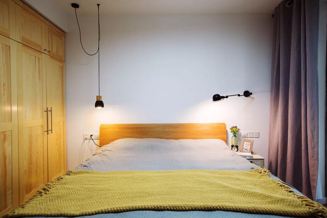 臥室沒(méi)有過(guò)多的裝飾,一邊木質(zhì)小吊燈、一邊伸縮壁燈,躺在床上各有一片空間來(lái)做自己想做的事。