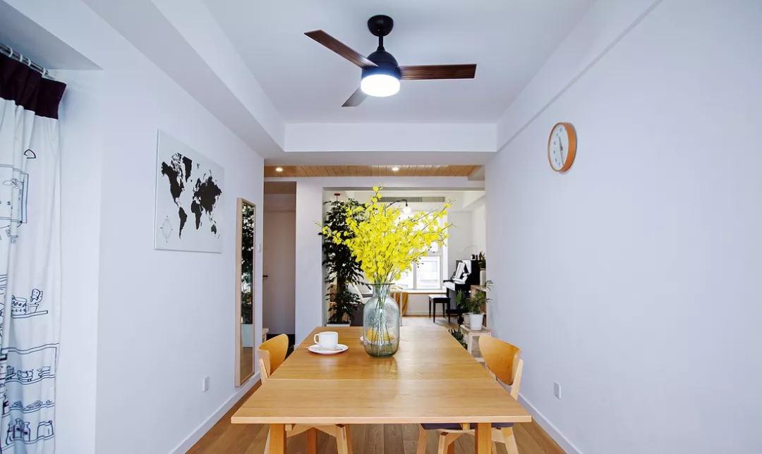簡(jiǎn)潔的餐桌椅,個(gè)性的吊扇燈,木質(zhì)掛鐘,桌上的跳舞蘭盡情綻放著。