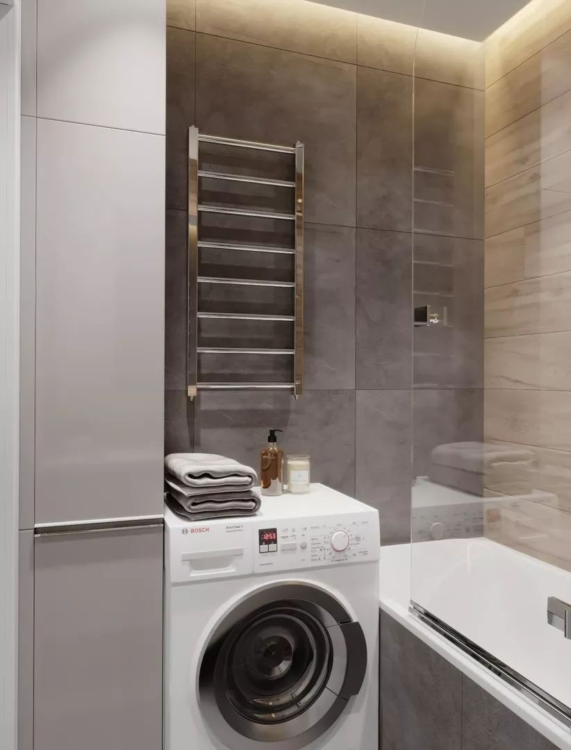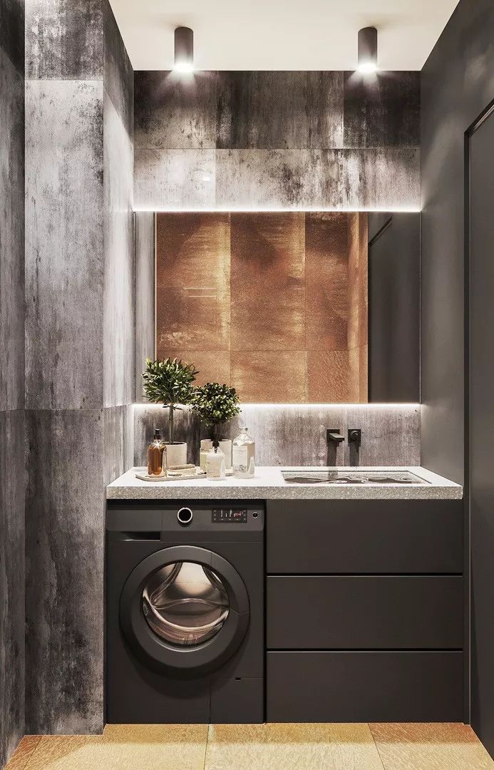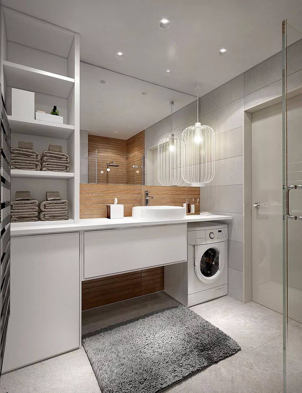 洗衣機(jī)設(shè)計(jì)在洗漱臺下,這樣排水非常方便,洗漱臺可以按照洗衣機(jī)的尺寸先定制好,還可以順便再做一個(gè)收納柜。