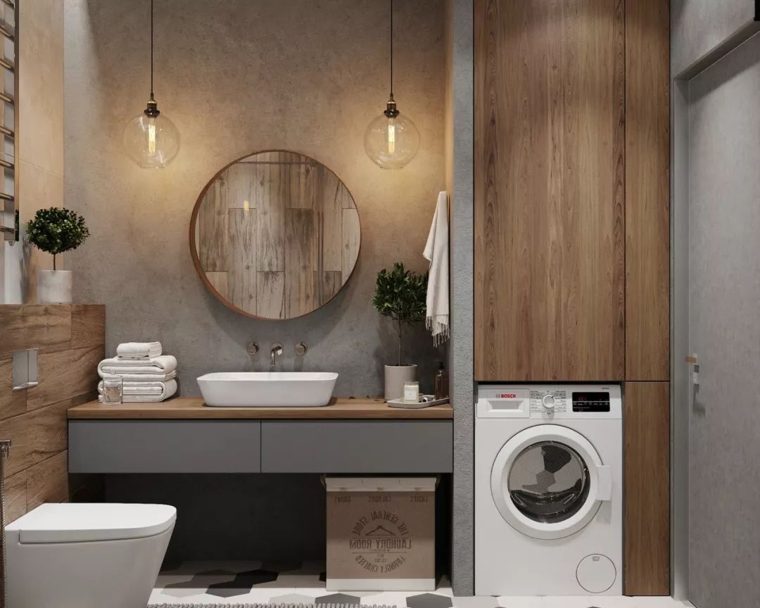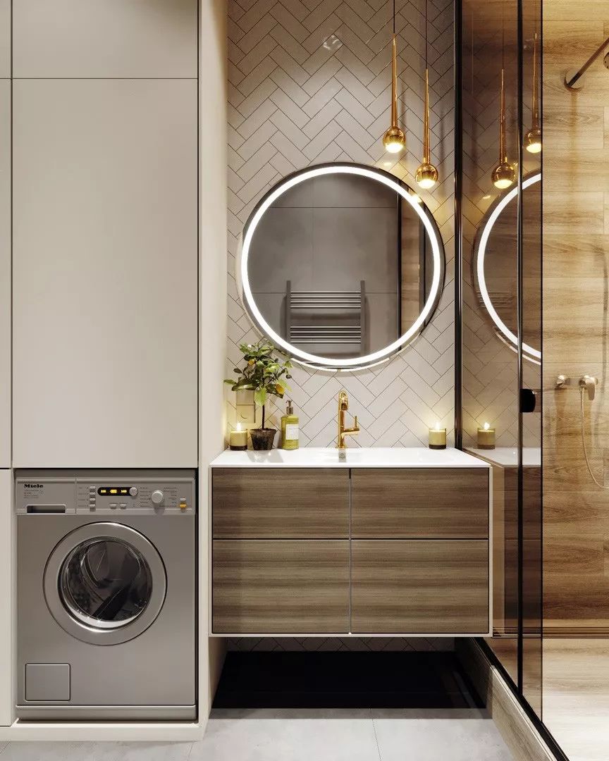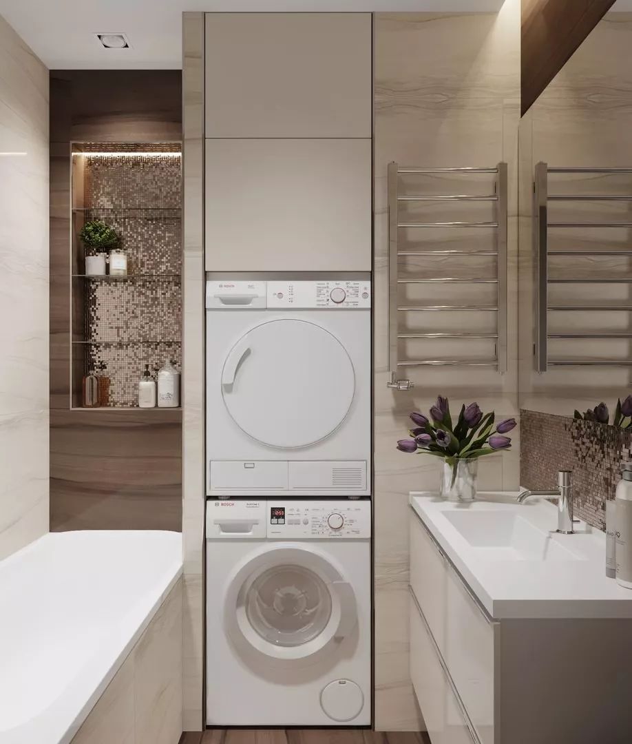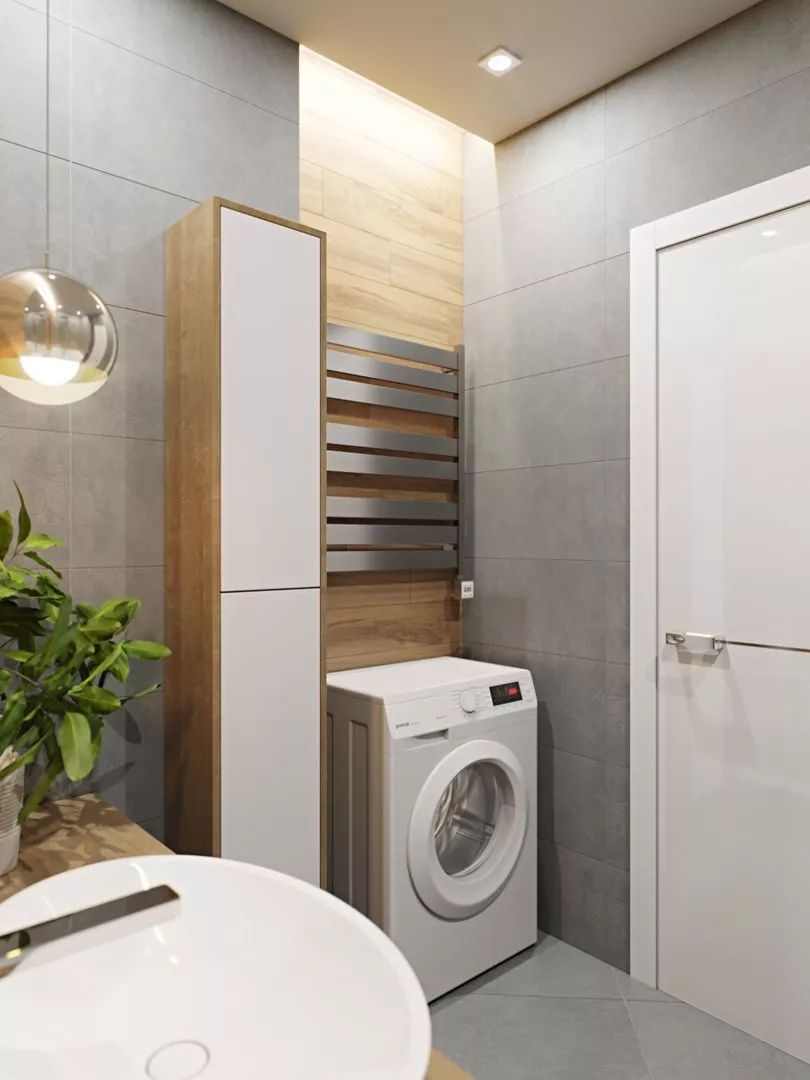 洗衣機(jī)設(shè)計(jì)在洗漱臺下,這樣排水非常方便,洗漱臺可以按照洗衣機(jī)的尺寸先定制好,還可以順便再做一個(gè)收納柜。