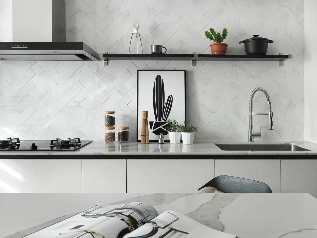 廚房墻面的隔板架上的綠植與瓶瓶罐罐擺設,也讓廚房顯得更加文藝精致。