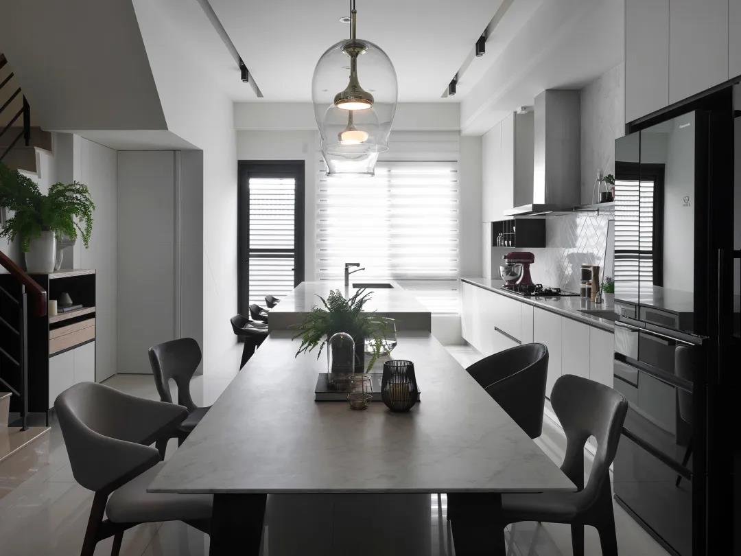 ▲餐桌與中島臺后方的是廚房區(qū)域,開放式的空間在一字型的格局下,餐桌與中島臺也兼具了廚房操作臺的輔助臺,讓做飯體驗更加舒適輕松。