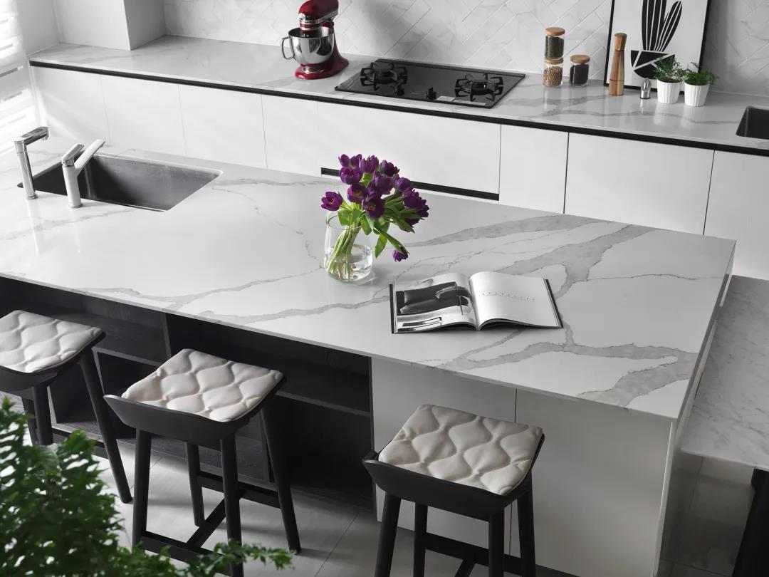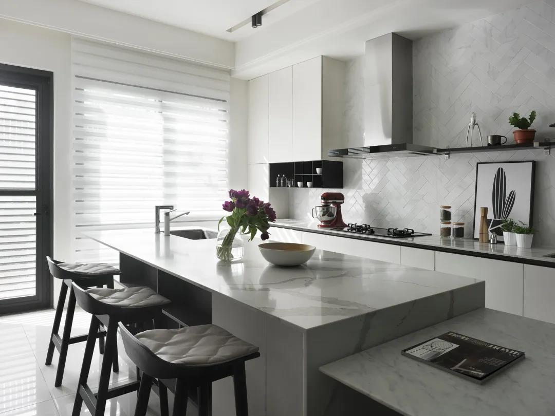 ▲挨著餐桌的中島臺,布置上幾張吧椅,營造出一種時尚優(yōu)雅的餐廚體驗。