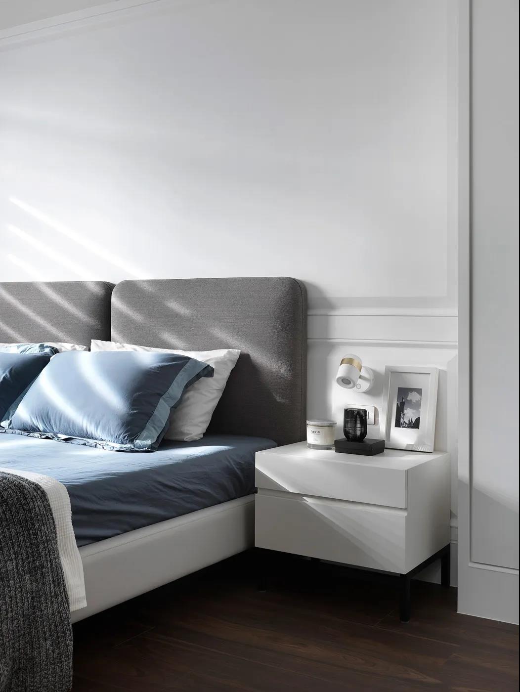主人房空間在淺灰色的基礎下,床頭墻是兩側帶邊框造型的護墻板+中間軟包的背景設計,結合金色的壁燈,還有雅白的床頭柜,布置出一個華麗溫馨的舒適臥室空間。