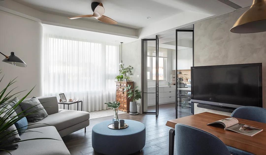 將工作室出入口重新調(diào)整位置,采用鋁框玻璃折疊門使其與客廳相互串連,通敞幽邃的視野景象,讓日光空氣徑自流通。