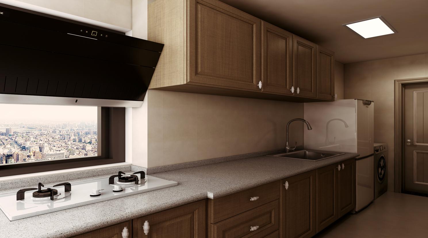 廚房的空間是一個(gè)細(xì)長(zhǎng)格局,櫥柜只能做“一”字行,還要考慮冰箱的位置,空間不太夠用,所以我建議業(yè)主將廚房和陽(yáng)臺(tái)打通,將灶具放到陽(yáng)臺(tái)的位置,這樣一來(lái)廚房的空間可以擺放一個(gè)洗衣機(jī)、一個(gè)冰箱和一個(gè)洗菜盆,還能擠出一個(gè)小的操作臺(tái)出來(lái)。業(yè)主是想先放冰箱,然后再放洗衣機(jī),這樣一來(lái)洗衣機(jī)臺(tái)面和櫥柜臺(tái)面能連到一起。但是我考慮到一進(jìn)廚房的位置有煙道,有下水管道,如果冰箱放到最邊上的話,整個(gè)煙道及下水管的位置就全部浪費(fèi)了,大概有50公分的長(zhǎng)度,這對(duì)于本身就不太寬裕的廚房空間來(lái)說(shuō),是非常奢侈的。所以業(yè)主最終聽取了我的建議,將冰箱和洗衣機(jī)換了一下位置,煙道角落的位置可以放置一些廚房電器,空間得到了最大化的利用。
