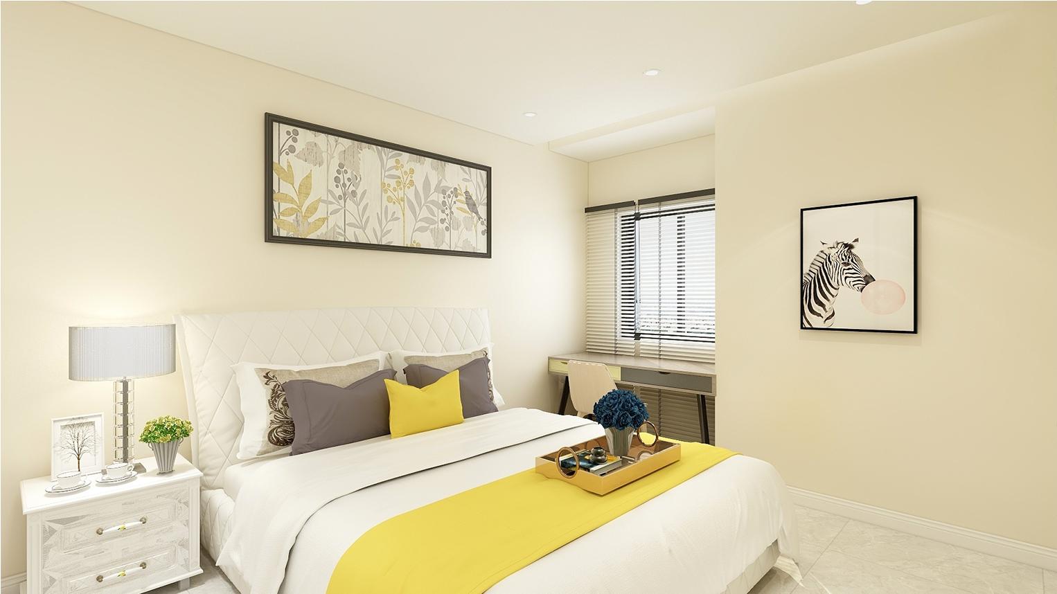臥室和整體風(fēng)格統(tǒng)一,做到舒雅實(shí)用。采用冷色調(diào)的窗簾,在整體的暖色調(diào)里加入了少許冷色,是整個空間更加和諧,床也是采用的原木色的床,整潔干凈,而且顯得很溫馨,大方得體,深色的推拉門讓空間更具有穩(wěn)定性,床頭的掛畫也讓空間更有靈性,墻面用了暖黃色的壁紙加兩個小臺燈增加空間的采光,床單被罩是比較靈動的條紋圖案,主臥室還放了一個電視,可以滿足生活的小需求?;疑牡卮u也讓整個空間的顏色更顯得高級,也是現(xiàn)在很流行的顏色搭配。
