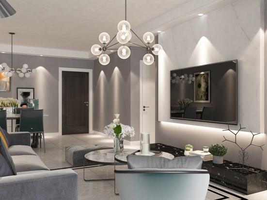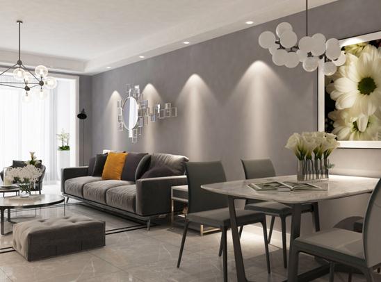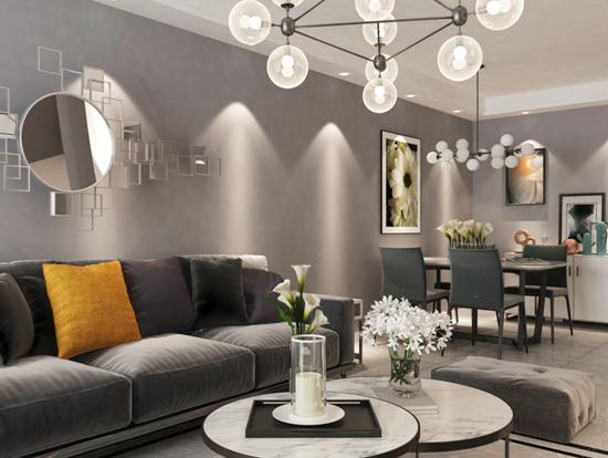 沙發(fā)背景墻沒有過多的處理而是選用的金屬原色的鏡面裝飾做搭配,整體提升了墻面的空曠感,也增加了空間的明亮性,給人一種時(shí)代氣息,客廳燈具采用了時(shí)尚性很強(qiáng)的魔豆燈,多個(gè)透明的燈罩以及黑色的燈桿,滿足了空間的照明也給現(xiàn)代風(fēng)格的演繹畫上圓滿的句號(hào)。
