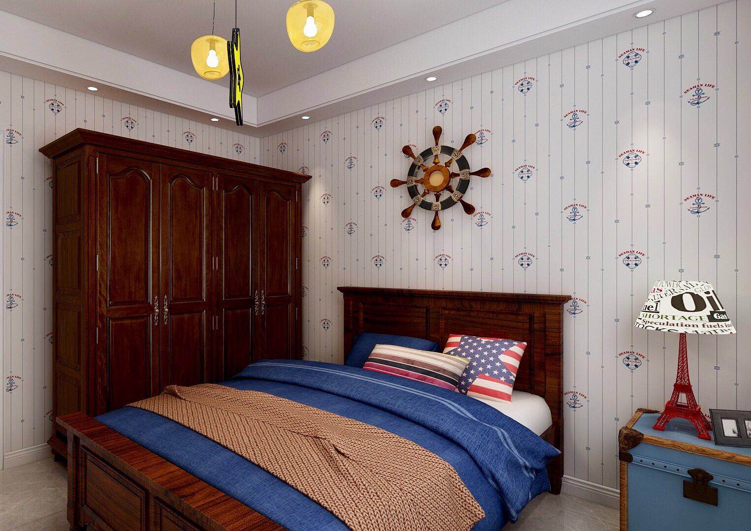 次臥室為兒童房,主人孩子現(xiàn)在還比較小,整體色調(diào)以藍(lán)色為主,整體清新自然,次臥選用了一個(gè)非常有趣的壁紙運(yùn)用了很多的復(fù)古元素,打造了一個(gè)溫馨且有層次感的臥室空間,整體沒(méi)有過(guò)多的復(fù)雜裝飾,為業(yè)主提供的簡(jiǎn)單的睡眠空間。