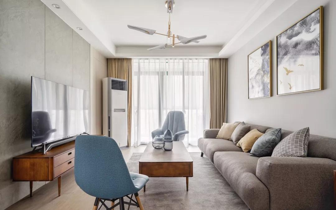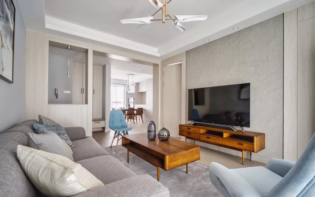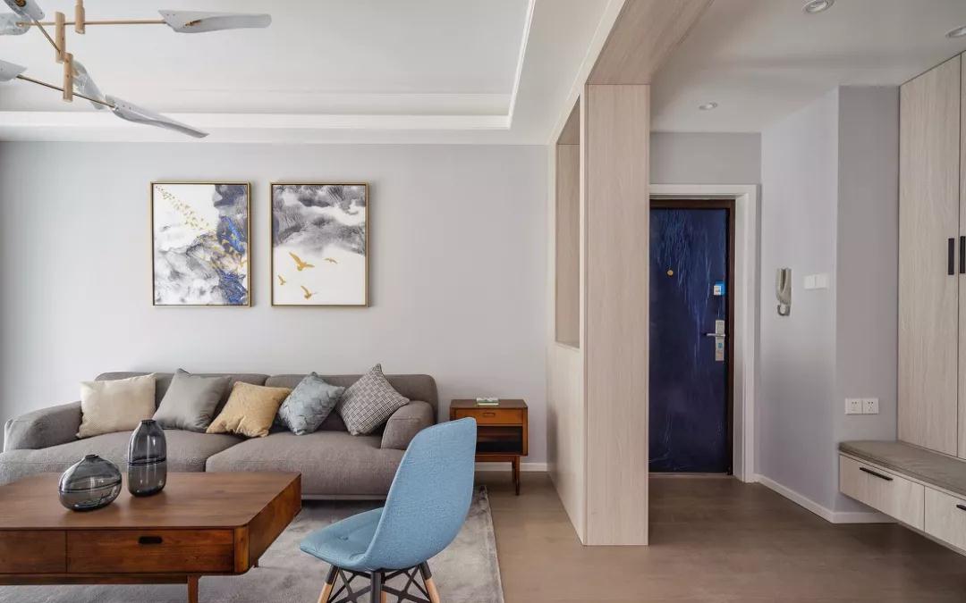 利用一深一淺的藍(lán)色,這組相色系作為整體的配角色,打破灰色沙發(fā)帶來的沉悶感。 光線透過黃色的窗簾,溫暖了略冷的基調(diào),由著木色元素貫穿全局。 堂前兩幅掛畫,些許水墨詩意,生活亦可處處皆詩意。 電視背景墻采用切片對稱的方