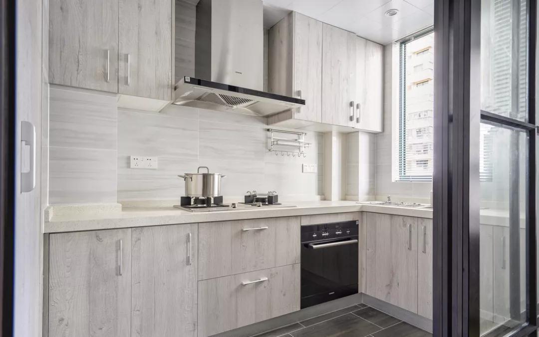 黑白灰+木色的經(jīng)典組合,運(yùn)用于不同的材質(zhì)上,板材、瓷磚、不銹鋼、石英石,形成了簡潔的廚房空間。