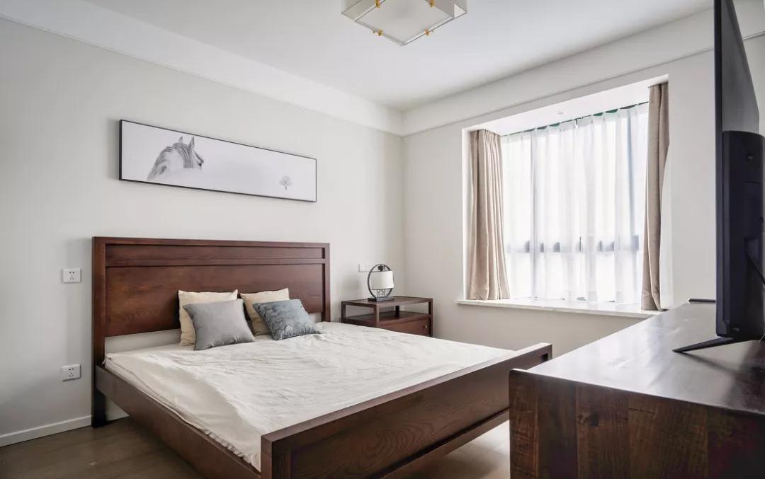 主臥空間是作為父母居住使用,沒有復(fù)雜的裝飾,延續(xù)外部的整體色調(diào),柔和色彩與深木色調(diào)和,營造出舒適的休息環(huán)境。
