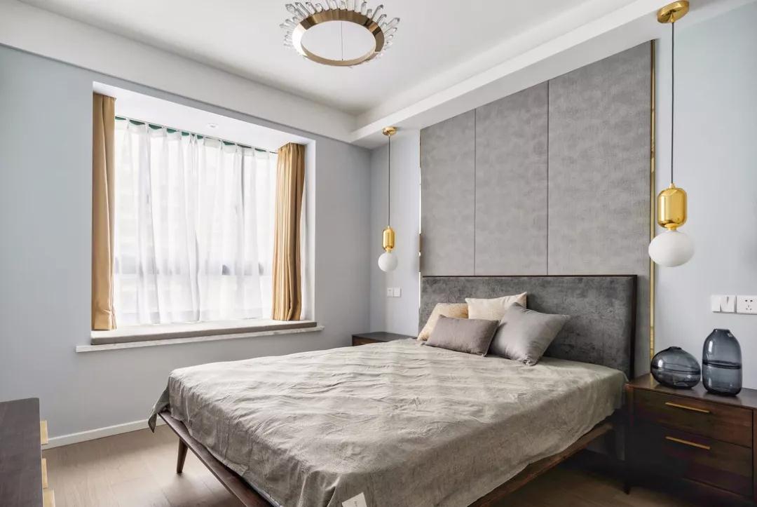 次臥,淺灰色硬包,在金色不銹鋼條之間更顯質(zhì)感。