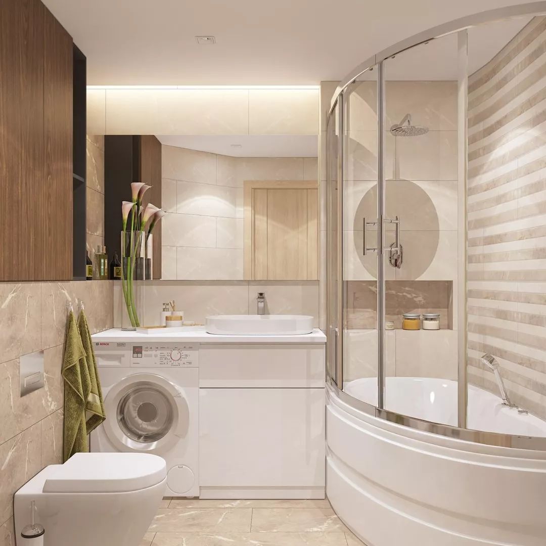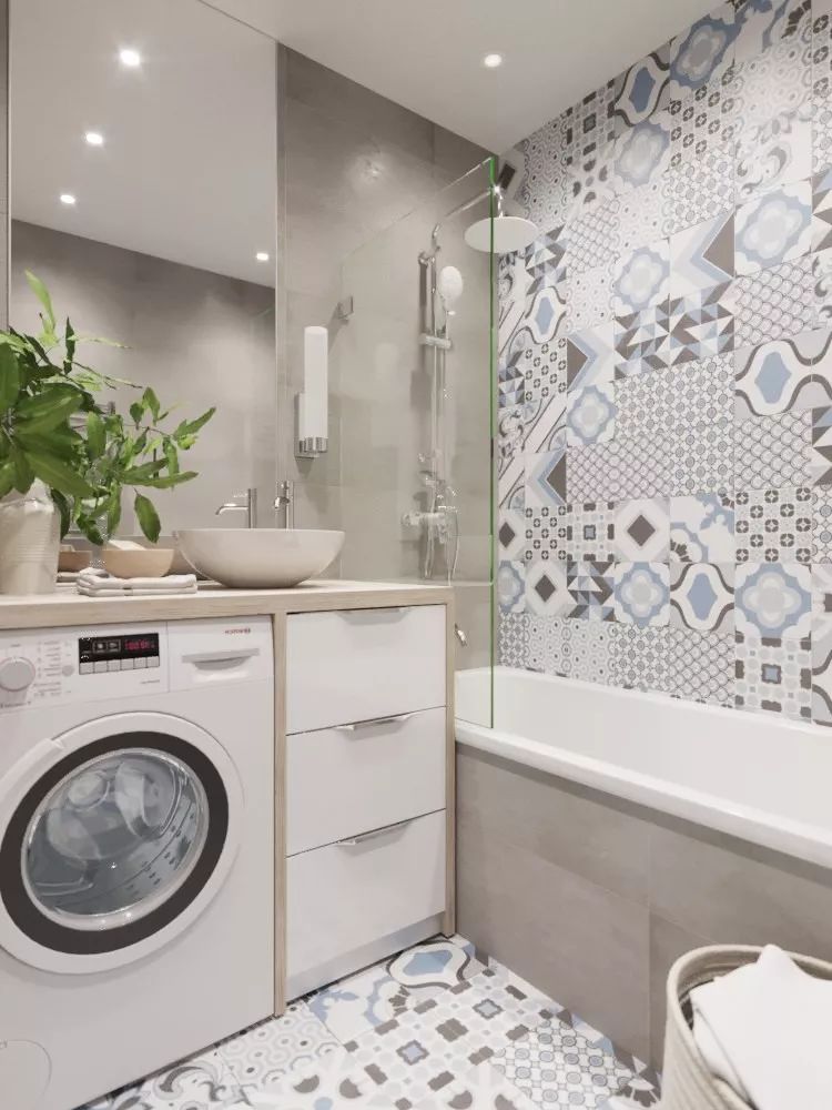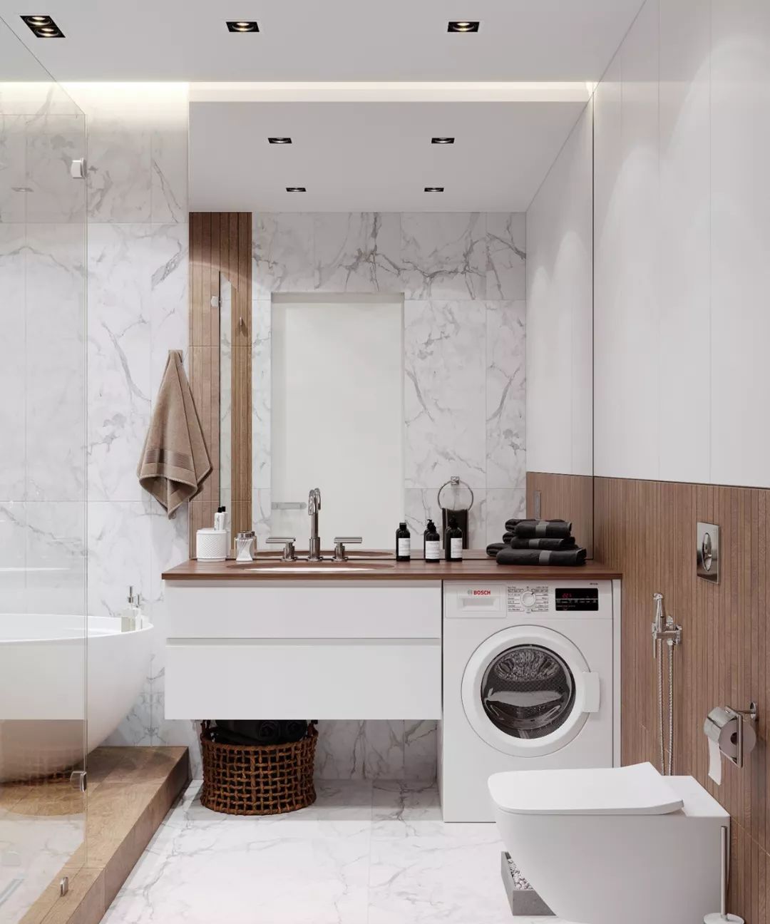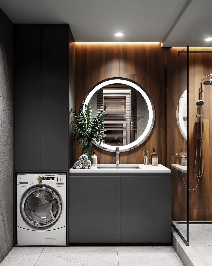 洗衣機(jī)設(shè)計(jì)在洗漱臺下,這樣排水非常方便,洗漱臺可以按照洗衣機(jī)的尺寸先定制好,還可以順便再做一個(gè)收納柜。